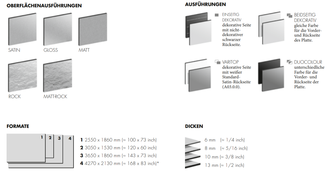- Formate: z. B. 3050 x 1530 mm, 4270 x 1860 mm